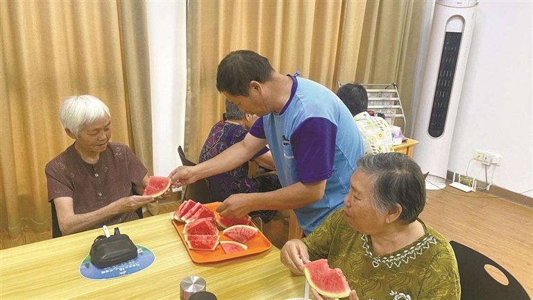 “为众服务工作室”里,胡为众给老人切西瓜