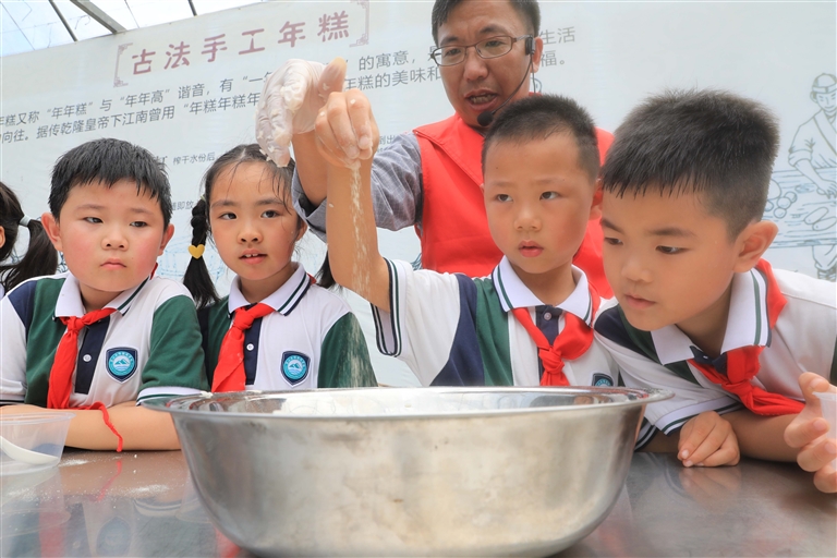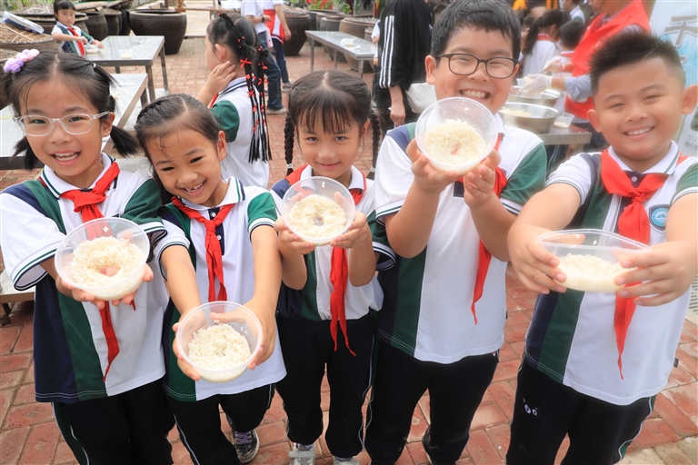 近日,在定海区马岙心亲侬研学教育基地,来自岱山县双峰小学的250余名师生正在开展“一粒米的旅程”主题秋季乡村研学活动。孩子们通过观察稻谷,体验收割秋稻、打稻谷、做酒酿、搓草绳等农事实践,感受“一粒米”收获的喜悦。 记者 陈永建 摄