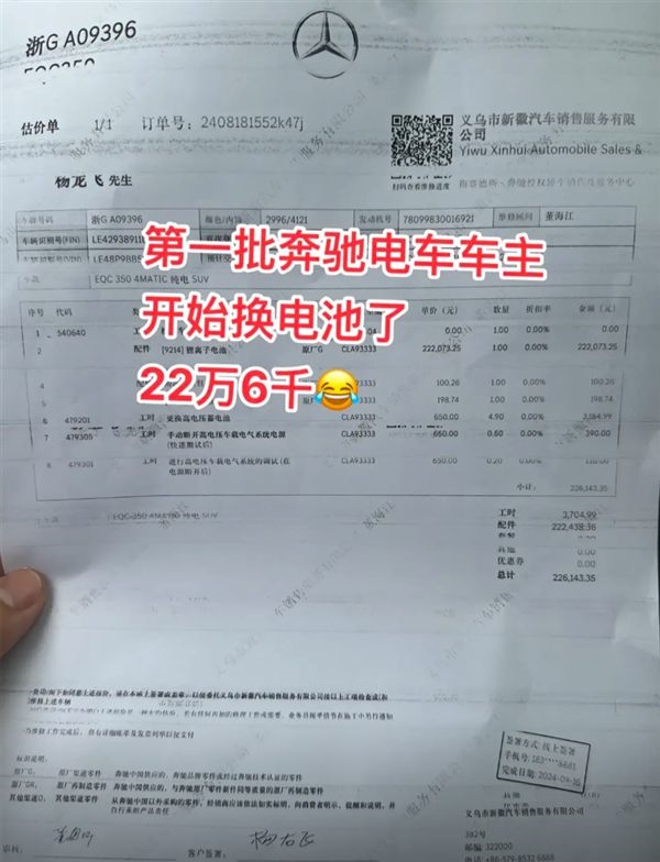 义乌新徽奔驰4S店市场经理蒋海民向记者确认了报价单属实,不过他表示,这份只是维修单,车主并未实际亲自支付电池更换的款项。