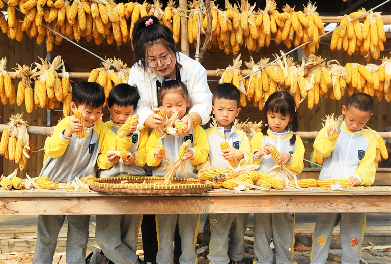 马岙当地一农场,一名老师正带着小朋友们体验劳动 记者 陈永建 摄