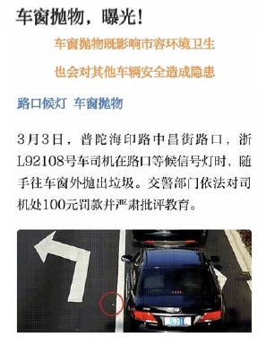 10月13日下午,浙L347××号轿车由西往东驶到海天大道长升路口,遇红灯刚一停稳,驾驶人便忙不迭地两次从车窗往外扔垃圾。约半小时后,浙L6C3××号黑色SUV也是驶到该路口候灯时,一扬手就把一个纸壳状的废弃物丢在了绿化带上。对这两起车窗抛物行为,新城交警已通知两名违法当事人到交警大队接受处罚。