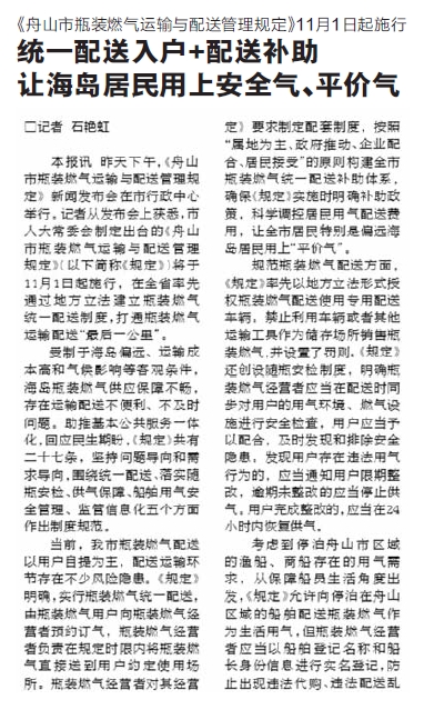 《舟山市瓶装燃气运输与配送管理规定》11月1日起施行,我市在全省率先通过立法建起瓶装燃气统一配送制度,打通瓶装燃气运输“最后一公里”,破解海岛居民用气难、用气贵问题(《舟山晚报》10月23日报道)。小岛居民用上安全气、平价气,意味着又补上了海岛民生的一块短板。