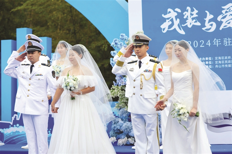 新人代表登台分享他们相识、相知、相爱的甜蜜故事。新郎们都是驻定部队的中坚力量,用青春和热血守护着祖国的海疆,身旁的新娘是他们心中所爱,也是他们最坚实的后盾。“感谢这场特别的婚礼让我感受到了军嫂的自豪和幸福。”“我会给他更多的理解和包容,因为他肩负着保家卫国的重任。”新娘们声音轻柔,语气坚定。