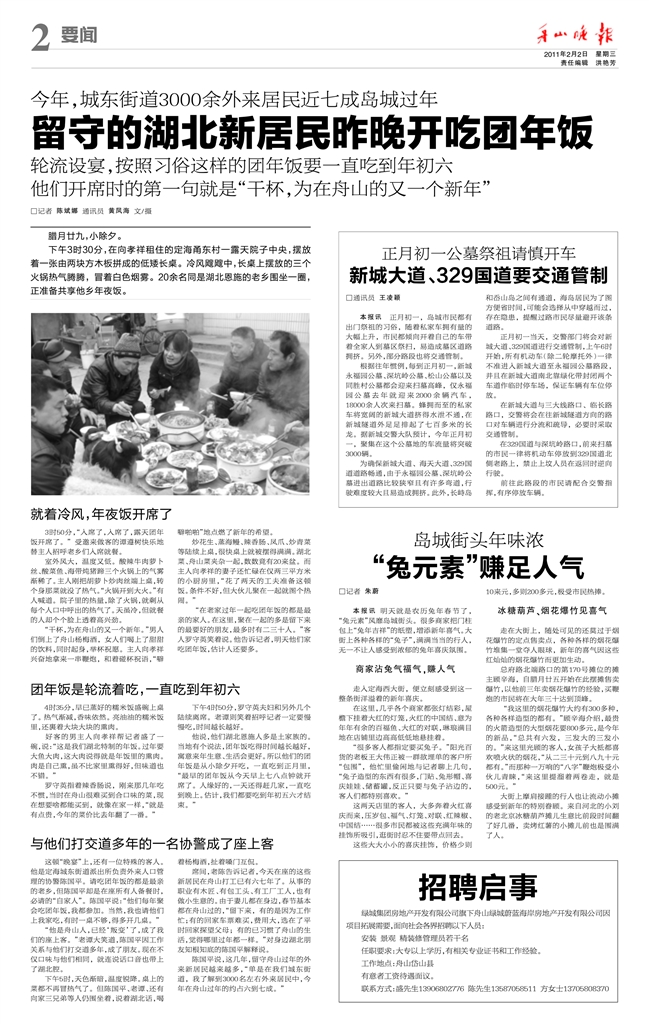 2011年2月2日,刊登在《舟山晚报》二版头条的《留守的湖北新居民昨晚开吃团年饭》的新闻,报道了湖北恩施的新居民欢聚一堂在定海城东街道共吃年夜饭的场景。这些新居民在舟山打工已有六七年了,从事木匠、包工头、工人,也有做小生意的。