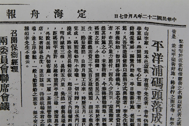 在这份报纸第二版头条以《平洋浦码头落成旅客交口称便》为题,报道普陀勾山大慈善家李拙子先生,于1933年乐善好施,慷慨解囊,出资三千五百元建造平洋浦混凝土码头1座、候船室3间和石板路一条。改变过去乘坐梅浦轮需用小船驳运上船落船之苦,方便旅客,受到老百姓交口称赞的新闻。