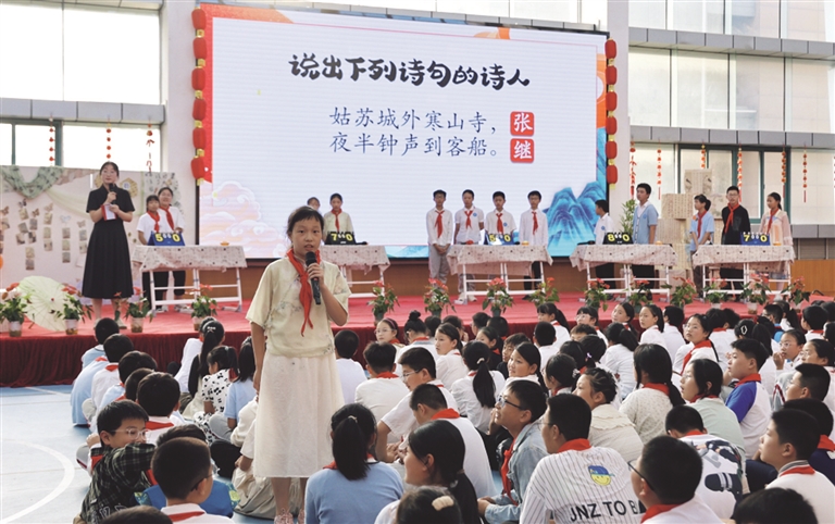 近日,沈家门第四小学举办了“诗词传古韵 经典润童心”古诗词挑战赛。比赛设置的诗词接龙、诗词迷宫、诗词表演、看图释义猜诗名、揭秘文人大档案等环节,进一步提升了学生的诗词素养,拓宽了他们的文化视野。