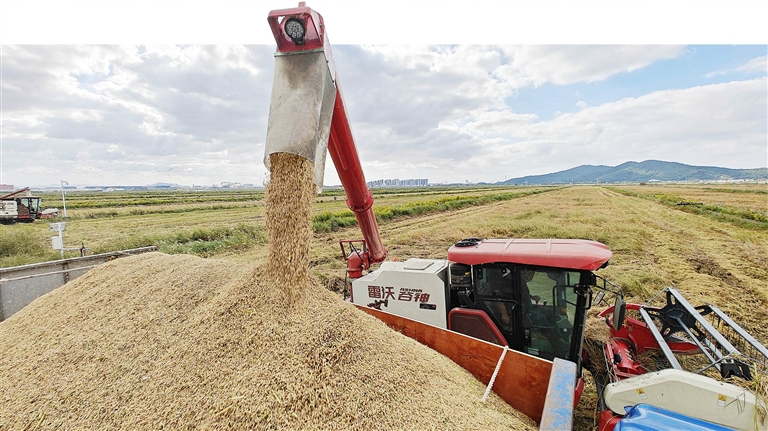 秋收时节,岱山县火箭盐场耐盐碱水稻基地一片金黄,农户们正在抓紧收割。今年,岱山县2400多亩耐盐碱水稻产量在100多万公斤,创历史新高,预计11月中旬全部完成收割。 记者 陈永建 滕海平 摄