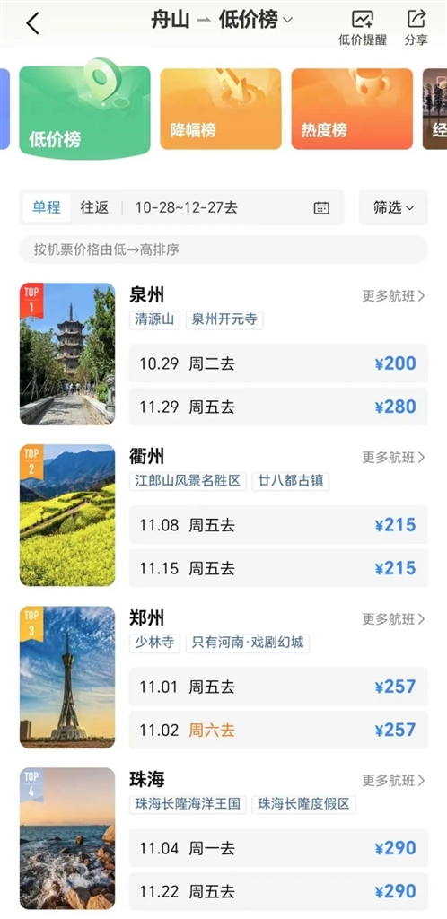 目前某旅行平台上的舟山出发的低价机票价格(右图),不少网友看到心动了:“太香了,马上就冲!”