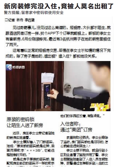 新城的李女士装修完新房自己还没入住,却被陌生人鸠占鹊巢了,情绪咋能不崩溃。而入住的3名杭州男子也挺委屈,明明是通过“美团”订的短租房,却闹出这么大的乌龙(《舟山晚报》10月24日报道)。事有蹊跷必有怪,还得把始作俑者找出来!
