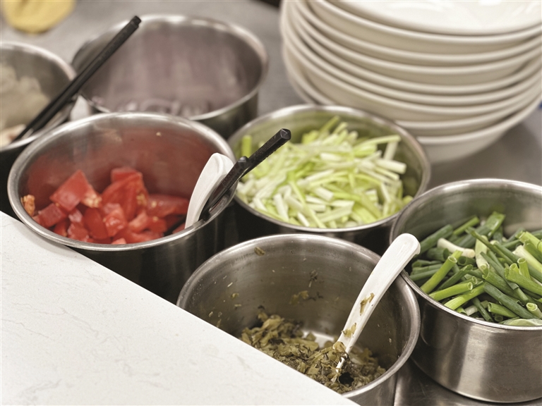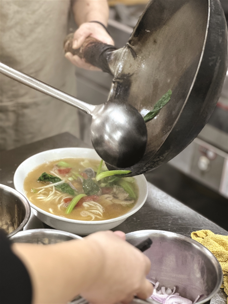 面条都是一份一份地做,不管是牛腩面、猪肝面、还是茄汁虾仁,食材下锅,都要经过爆炒,这才能把滋味都炒出来。哪怕是上座率最高的午间高峰,客人愿意等,虽然上菜慢一些,但味道是好的。