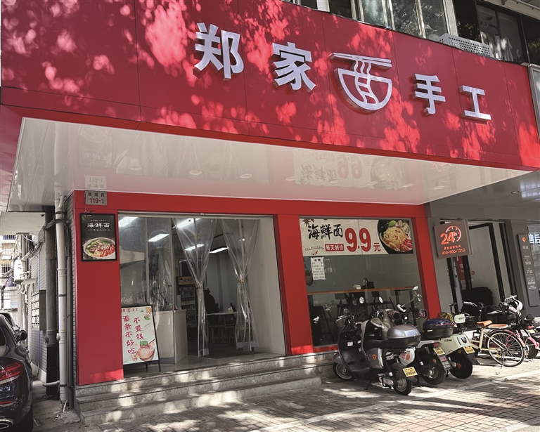 郑贤华原本想过把做面条也放在店里,明档玻璃,一目了然。但是店里的温度、湿度有点高,一旦温度高起来,加了鸡蛋的面很容易就发酵,影响口感。