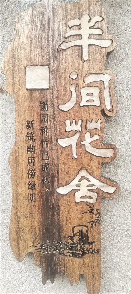 花舍建在老家,曰:半间花舍。有名有姓,照片传过来,木质的匾名也挂了上去。