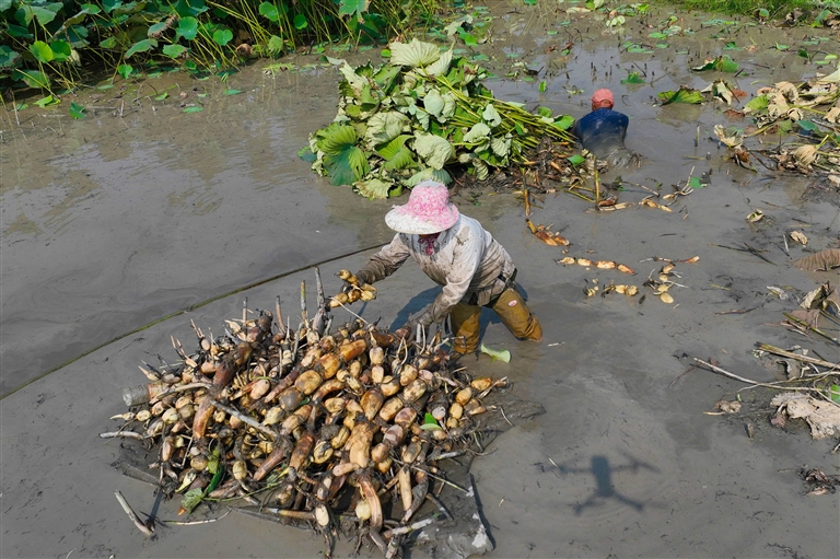 定海区白泉镇河东社区,农户收获莲藕