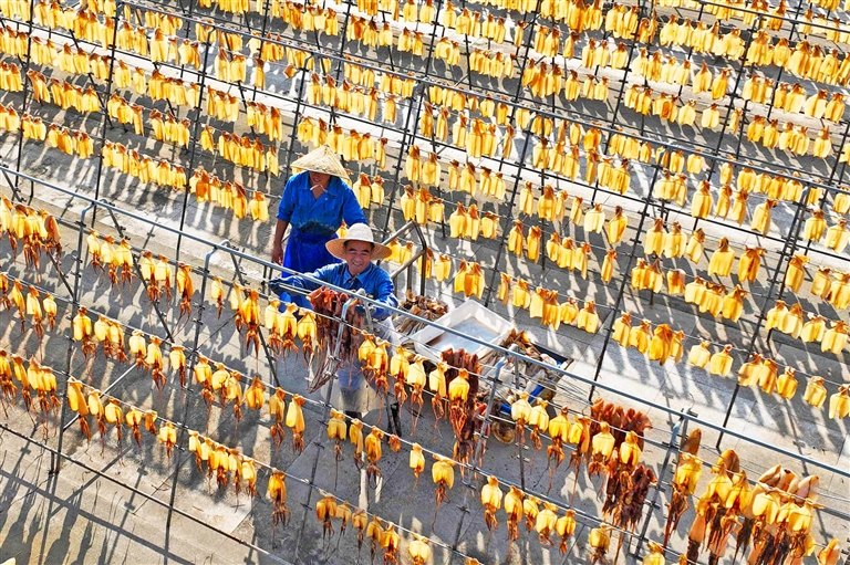 普陀展茅一家水产企业晒场内,工人忙着晾晒鱿鱼鲞