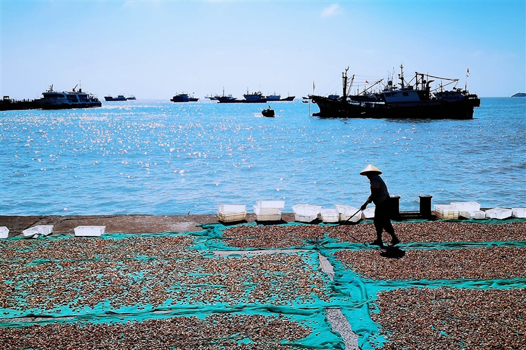 嵊泗县嵊山镇海边,养殖户晾晒贻贝