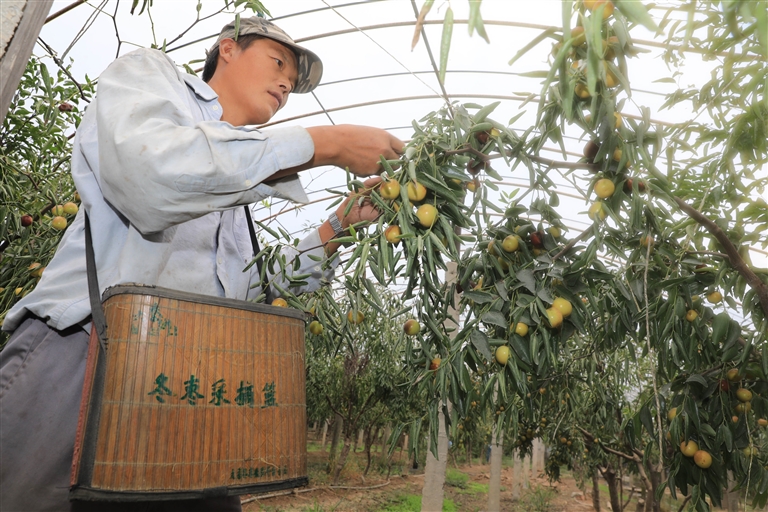 定海区白泉镇河东村一家庭农场,工人采摘冬枣