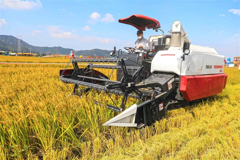 普陀田园综合体,农户正在收割水稻