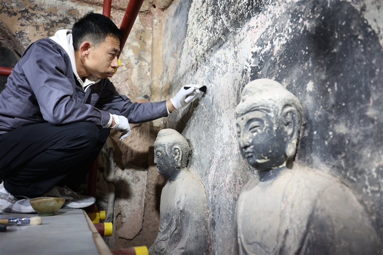 麦积山石窟艺术研究所文物修复人员杨志强在麦积山石窟32窟内进行保护修复工作。
