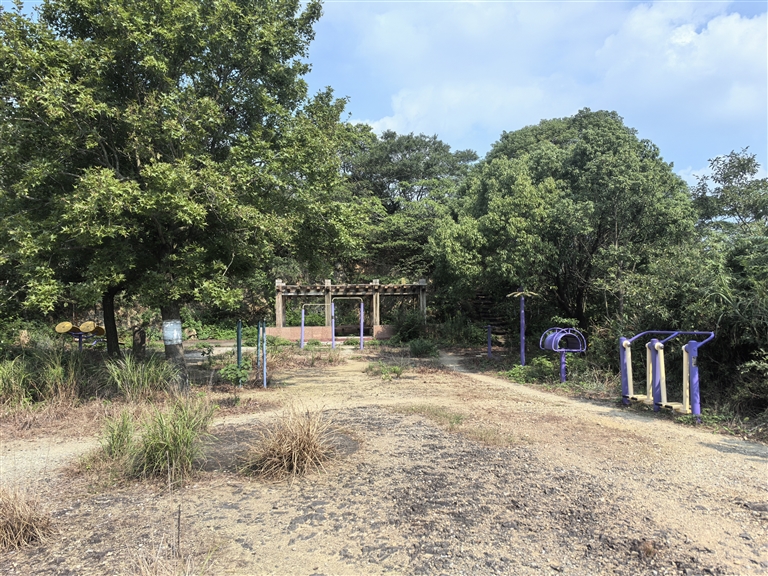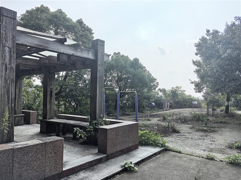 记者看到,山岗上的晨练场面积相当于一个篮球场,绿树成荫,空气清新,有健身器材、有躲雨亭,依稀可见这里曾是许多居民晨练的好地方。