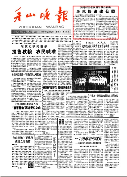 采写刊登在1996年12月10日《舟山晚报》报眼的这则《浦湾村三老汉谱写愚公新篇 垦荒修路建公园》新闻的两位通讯员,记者通过各方努力,至今未取得联系。然而,这篇新闻中三老汉之一的郭型尚的故事在记者陈海维采写的另一则新闻中有了新进展。
