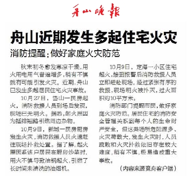 10月27日,岱山一民房起火;10月9日,新城一民房厨房发生火灾;10月9日,定海一小区住宅起火。近期,舟山已发生多起居民住宅火灾事故(10月31日《舟山晚报》报道)。