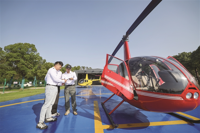 11月5日,在湖州米旗通航直升机飞行基地,飞行教员(右一)带领学员进行日常培训。