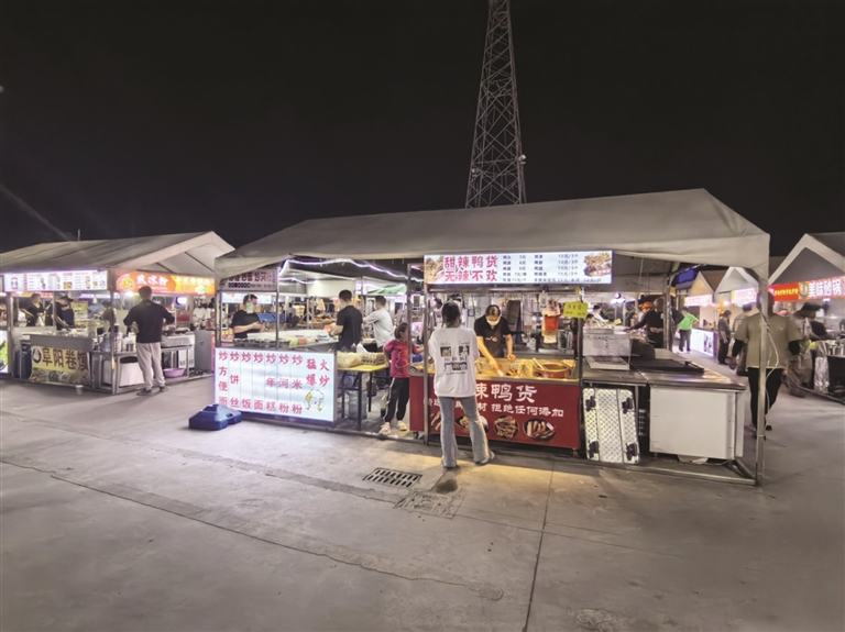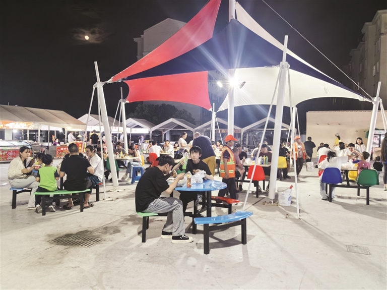 “夜市北部新建了公共就餐点、市场管理房,还增设了摊位点、摊主车辆停放点,西部扩建区域增加了公共厕所、污水集中沉淀池、电动自行车停放点和垃圾处理点,摊位帐篷也进行了统一。”夏贤军说,小干岛夜市升级改造后,经营户由40余家增加至93家,摊位数达116个。