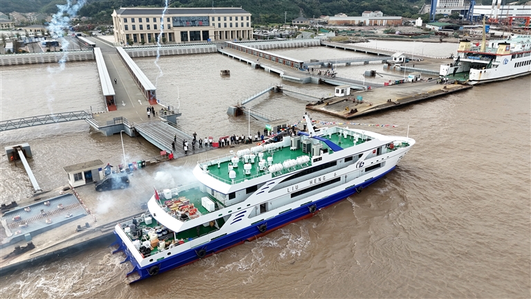 本报讯 昨天下午,普陀六横大岙客运码头鞭炮齐鸣,全新建造的“六横6”轮缓缓靠拢码头。该客轮即将投入六横至沈家门的运营,以进一步提升六横岛际交通运输能力。