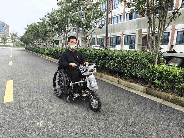 虽然坐在轮椅上,罗文达还是难掩一脸的阳光与自信,很快他驾驶着电动轮椅,引导记者在他的宿舍楼附近停好汽车。