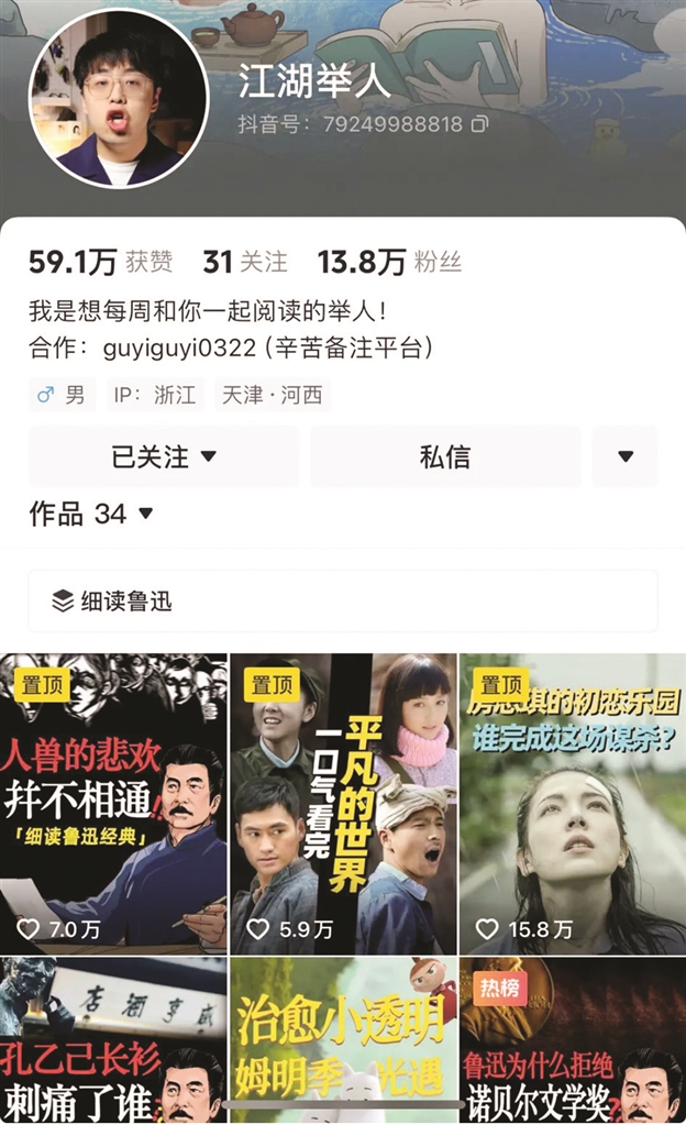 扬子晚报紫牛新闻记者采访了带大家“沉浸式”阅读的“95后”女孩@七月狂奔、带着一口播音腔讲述作家人生故事的江苏小伙@李星河LXH、结合当下热点解析经典作品的@江湖举人,看这群“真书生”如何笑傲短视频“江湖”。