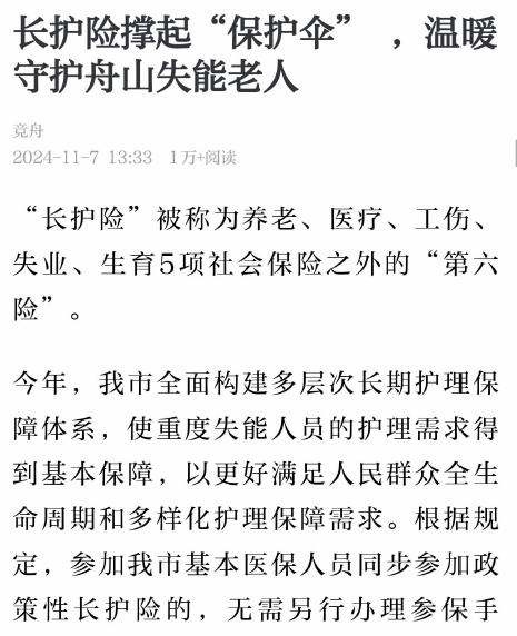 目前,舟山有200多名“长护险”护理员,每天奔波在各海岛,使重度失能人员的护理需求能够得到基本保障,受到了老百姓点赞(据11月12日《舟山晚报》)。