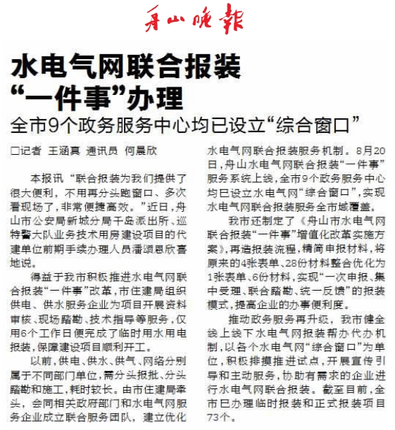 企业申办供电供水等不用再多头跑,舟山市水电气网联合报装“一件事”服务系统上线后,全市9个政务服务中心也均设立了水电气网“综合窗口”实现水电气网联合报装服务全市域覆盖(《舟山晚报》11月12日报道)。原本分散的“多件事”变成了统一受理的“一件事”,企业和群众当然省心省力,这正是“整体政府”的提质增效。