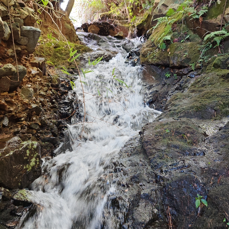 沿溪继续前行。突然听见“哗哗”的水声,循声望去,只见一帘瀑布挂在眼前。瀑布落差约十米,宽处约两米,听老农说,瀑布上面是一座水库,那里就是小溪的源头所在——问渠那得清如许,为有源头活水来!瀑布下面被冲击形成一个小水潭,水潭面积约五十平方米,深约一米,亦是清澈见底,无奈没带泳衣,不然定会入水嬉戏一番。