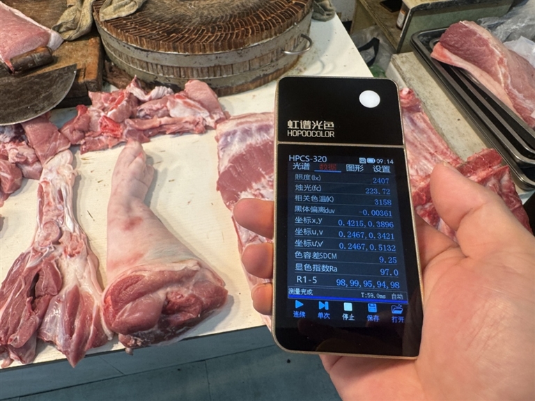现场,执法人员用虹谱光色检测仪进行检测,发现这些摊位使用的照明设施,照度值均在200以上,显色指数Ra大于等于80,且特殊显色指数R9大于等于0,符合相关规定。
