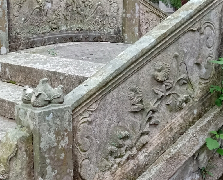 石拱桥悠悠然跨立于小池塘之上,南北跨卧,与永寿桥、海会桥相比,文昌阁的石拱桥可能显得小巧玲珑了,但望柱、栏板、抱鼓石等一应俱全,整体保存较为完善。石拱桥的拱券由块石干砌而成,规整圆润,呈半圆形。栏板上沿并不死板,中间栏板的上沿呈现弧形,略显圆润,而两侧雕刻梅兰竹菊图案的栏板,则呈平形,其相连接的抱鼓石则呈云纹线条,一眼看去,简朴中透露着无限的视觉美感,十分灵巧。