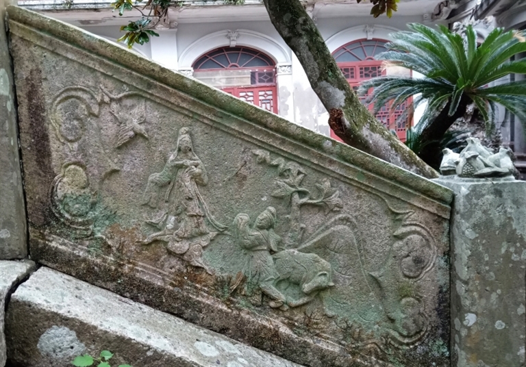 栏板雕刻的民间传说故事,内容多与普陀圣地的观音文化有关。其中的一通栏板,雕刻的是关于观音得道的民间故事,童子手捧净瓶,瓶口伸出杨枝一叶,观音俯首看杨枝生根而得道。另有一通栏板,刻画的是观音菩萨授经的场景,观音手捧经卷,慈祥可敬,一个戴着斗笠的牧童俯首称谢,身边还有一头卧牛,牛身上雕刻的旋转纹也十分清晰,堪称精细。