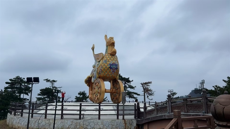 看那金银台,在阳光的映照下,熠熠生辉,恰似诗中“日月照耀金银台”的奇幻之景。“天鸡台”上,“天鸡”足踏日月双轮,巍然昂首天外云端,正是“半壁见海日,空中闻天鸡”的磅礴气势……