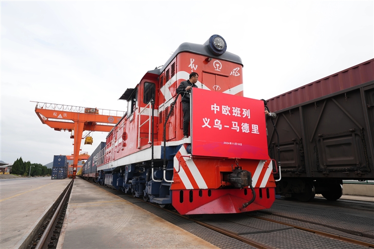 当日,一趟满载110个标准箱日用百货、汽车配件、机械设备等出口货物的中欧班列从义乌西站驶出,驶往逾1.3万公里外的西班牙马德里。义乌中欧班列开行十年来,累计开行逾6700列,发运逾67万标准箱,为“世界小商品之都”义乌“买全球、卖全球”提供重要运力支撑。