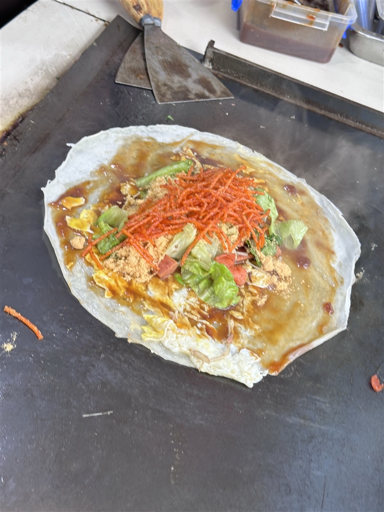 糖醋鸡蛋饼在铁板上摊制,先煎火腿肠,铁板上发出“嗞啦嗞啦”的声响,加入金针菇,翻炒后再加一把生菜。这边的内馅准备得差不多了,再开始加工饼皮。饼皮都是大早上到店后再摊的,此时要做的,就是把饼皮加热,再磕个鸡蛋,刷上糖醋酱。整个四四方方地包裹起来,糖醋鸡蛋饼便热乎乎地出炉了。