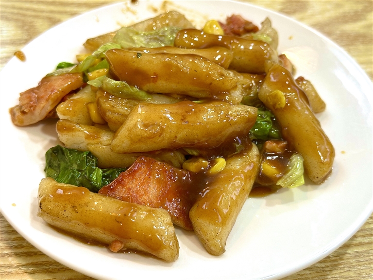 台州的米面也一直闻名,加入蔬菜和肉丝,炒得干干的,上桌就是香喷喷的一盆。前几年还在东港吃到了台州的嵌糕,也是在台州人开的小吃店里边,嵌糕即是把热腾腾的年糕摊成饼状,裹入炒好的菜和红烧肉,最后浇入的一勺红烧肉汤汁堪称灵魂酱汁。倒是这个糖醋鸡蛋饼之前没有听说,那先吃起来。