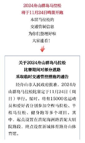 舟山群岛马拉松将于11月24日上午7时30分在东港普陀大剧院鸣枪开赛。本届舟马赛事总规模15000人,共有来自中国、法国、英国、澳大利亚、韩国、加拿大、埃塞俄比亚等17个国家和地区的选手报名(《舟山晚报》11月19日报道)。“跑”出海洋城市新风采,无尽精彩值得期待。