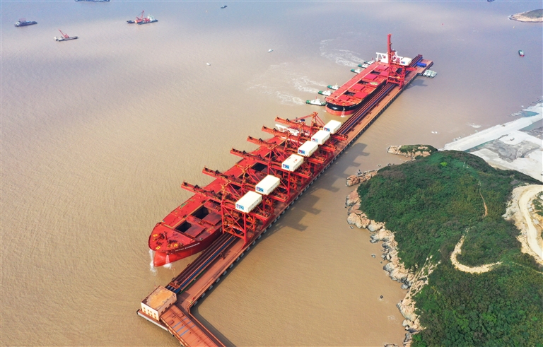 两艘世界最大的40万吨级矿船在同一座单体码头同靠接卸,这在全球尚属首次。见证这一历史时刻,浙江省海洋经济发展厅总工程师罗松认为:“这次全球首靠意义非凡,不仅标志着宁波舟山港创造了全球新纪录,也标志着落地浙江的全国首个大宗商品资源配置枢纽有了实质性推进,进一步提升了宁波舟山港服务‘双循环’新发展格局的能力。”
