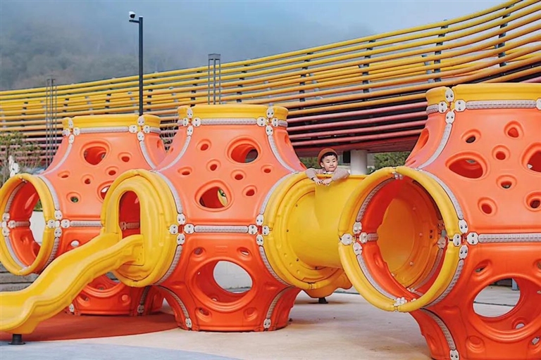 要是带着小朋友来这里,体育公园的儿童游乐区也准备好了。在橙黄的滑梯玩耍,享受自由的童年时光。踏上廊桥,偌大的公园风光一览无余,足球场、篮球场、轮滑场……各个运动场地划分清晰,可以和小伙伴们一起尽情挥洒汗水。