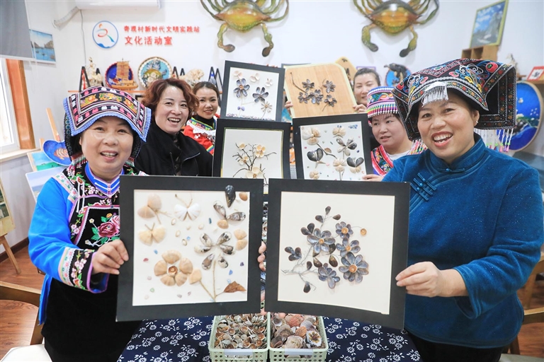 嵊泗县枸杞乡奇观村文化礼堂“知心姐姐”工作室,当地村民和少数民族群众正在一起制作贝壳画 记者 陈永建 摄