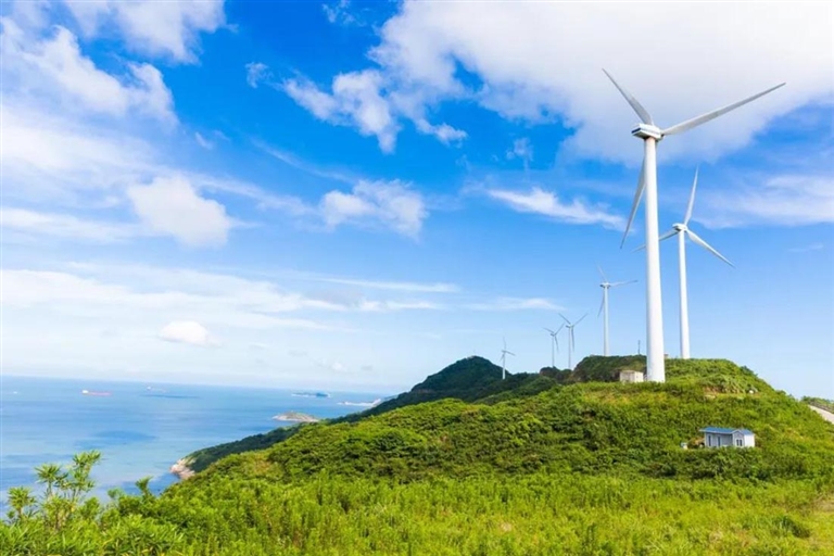衢山被称为风车王国,又有着“东方小荷兰”的梦幻场景。巨大的风车随着海面上吹来的风不停旋转,站在风电观光平台上,看群山、岛礁,还有连成一线的海天。