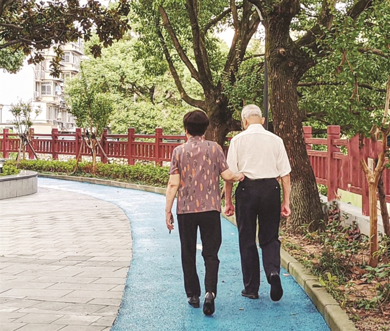 那道风景,亮点缤纷,而引我注目的,却是一对“款步”而行的老人。那是一对80岁左右的老人,他们看似并行,但细看,男的超前一点,女的在男的左边,伸出右手,托扶在男的后腰,就这么一点点落差(见图)。而他们步幅相同、步速一致,姿态稳定。