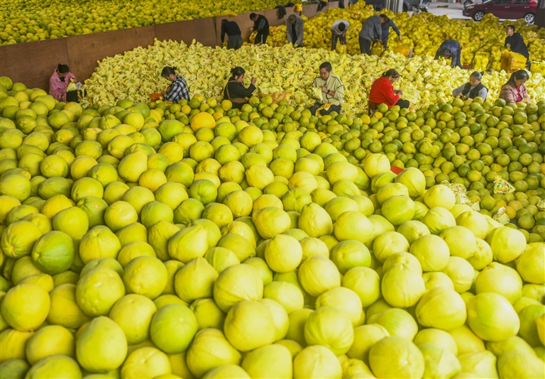11月23日,在湖南省永州市江永县粗石江镇云雾山香柚专业合作社,工人在包装柚子。