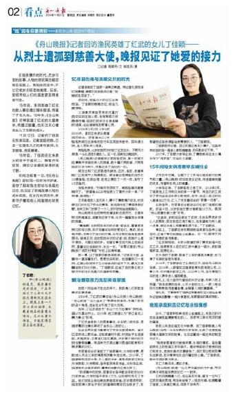 平民英雄丁红武舍己救人的感人事迹至今仍历历在目,他的女儿丁佳颖已在不知不觉中完成了从烈士遗孤到慈善大使的美丽蝶变(《舟山晚报》11月21日报道)。新闻记载着历史,也见证着爱的接力,让大家在时时感动中汲取生生不息的正能量。