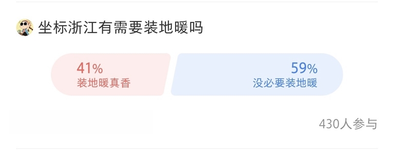 网友给出了各种各样的回答。在一个有430人参与的调查中,支持装地暖的比例为41%,而反对装的,占59%。“四六开”,不支持装的居多。