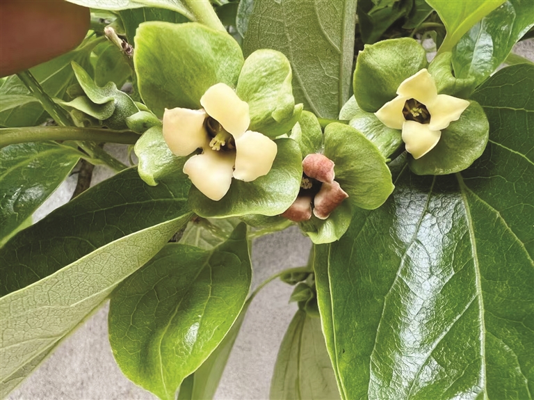 柿子花开起来的时候是一簇一簇开的,浅粉中带着一点紫色,和满树的枝叶搭配在一起,非常漂亮。到了夏天的时候,青色的果子就慢慢长出来了,因为颜色和树叶比较接近,看着不太明显,但仔细辨认,就能看到绿色的叶子底下垂着一只只果子。今年夏天特别热,雨水少,我每天都会从定海跑过来给它们浇水。